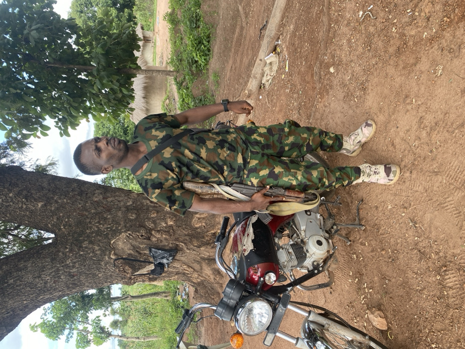 The image portrays an outdoor, daylight scene in Wukari, Nigeria, featuring a man, a motorcycle, and a natural, semi-rural environment. **Location and Environment:** The scene is set on unpaved reddish-brown dirt ground with visible tire tracks. A large, multi-trunked tree with prominent bark occupies the left side of the frame, with green foliage visible at its top. In the mid-ground to the right, two traditional, circular huts with conical thatched roofs are visible, indicating a residential area. Lush green trees and vegetation form the background, and the sky is partly cloudy. **People:** One adult male, appearing to be of African descent, stands upright in the center-right of the frame. He wears a camouflage pattern short-sleeved shirt, matching cargo pants, and light-colored tactical boots. A dark shoulder strap crosses his chest, and a dark watch is on his left wrist. He holds a rifle, consistent with an AK-variant featuring a wooden stock, in his right hand, resting it vertically against his side. The man is looking towards his right, away from the camera. **Objects:** To the man's left, a red and black motorcycle is parked on its kickstand. The motorcycle's fuel tank shows signs of wear and paint damage. A black garment, possibly a bra, and a black plastic bag are seen hanging from a lower branch or protrusion on the trunk of the large tree.
