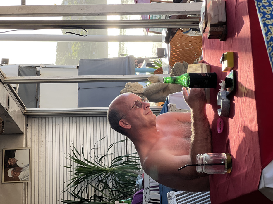 The image depicts a shirtless Caucasian male seated at a red-clothed table within an open-air establishment, identified by a beer koozie as being in Jimbaran Bay, Jimbaran, Indonesia