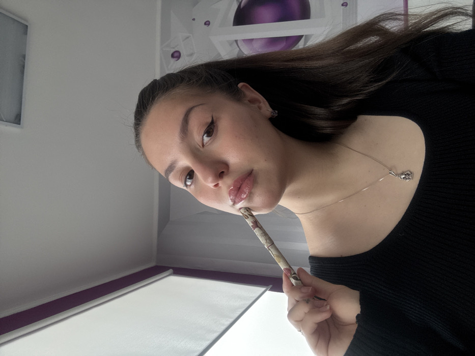 The scene is an indoor setting within the city of Chaikovsky, Russia. A female individual, appearing to be in her mid-20s to early 30s, is positioned centrally, looking directly at the camera. She has long, dark brown hair styled in a high ponytail and wears a black, long-sleeved scoop-neck top. Her makeup includes winged eyeliner and glossy lips. She is accessorized with small, possibly square-shaped, silver-colored stud earrings and a silver-colored chain necklace with a small pendant depicting an animal, resembling an owl. Her left hand holds a cylindrical object, approximately 15-20 cm long, decorated with a beige, red, and brown floral or patterned design. One end of this object rests against her lower lip. The background features a light-colored wall and ceiling. To the left, a window is partially visible, covered by a white roller blind. To the right, a wall decoration consisting of white geometric structures and prominent purple spheres is present. A rectangular light fixture is visible on the white ceiling.