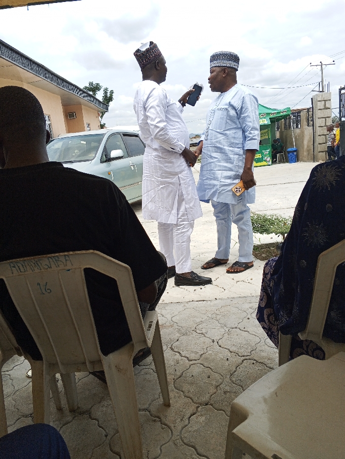 This image depicts an outdoor scene in Otite, Nigeria. In the immediate foreground, the back of a light-colored plastic chair with "ADANGARA 16" inscribed on it is visible, occupied by an individual in a black shirt. To its right, another unoccupied light-colored plastic chair is partially visible. In the midground, two adult males stand facing each other on patterned concrete paving. The male on the left wears a white traditional tunic and trousers with a matching patterned cap; he holds a dark-colored smartphone to his right ear/mouth, appearing to be speaking into it. He wears dark, studded loafers. The male on the right wears a light blue traditional tunic and trousers with a dark patterned cap; he holds a light-colored smartphone in his right hand and wears dark leather sandals. Their posture suggests a conversation or interview. In the background, a light-colored sedan is parked to the left, behind the standing men. A residential or commercial building with a light-colored facade is partially visible beyond the vehicle. To the right, further back, a green market stall or kiosk is visible, along with utility poles and overhead power lines. The sky is overcast.