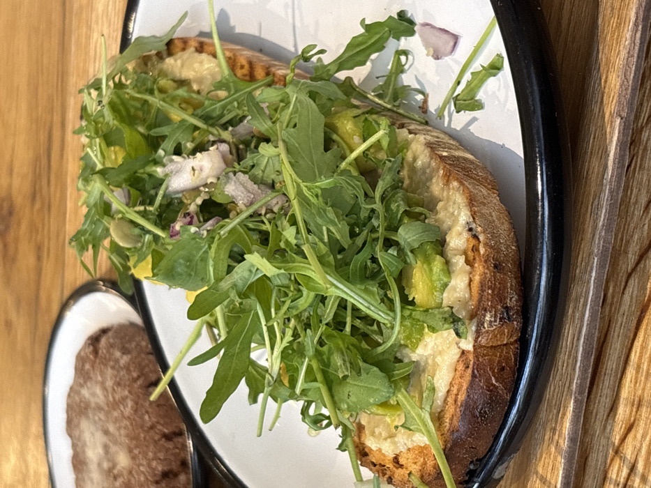 The image displays a close-up, eye-level view of a single slice of toasted bread served on a white plate with a black rim. The toast is topped with a light-colored, creamy spread, cubed avocado, a generous portion of green arugula, small pieces of red onion, and some seeds. The toast exhibits visible grill marks. In the blurred background, a small, round, brown item, possibly a cookie or patty, rests in another similar white plate with a black rim. The plates are situated on a light-brown wooden surface, likely a table. No individuals, actions, or specific Parisian landmarks are discernible, therefore, the exact location within the city of Paris, France, cannot be determined from the provided visual information.