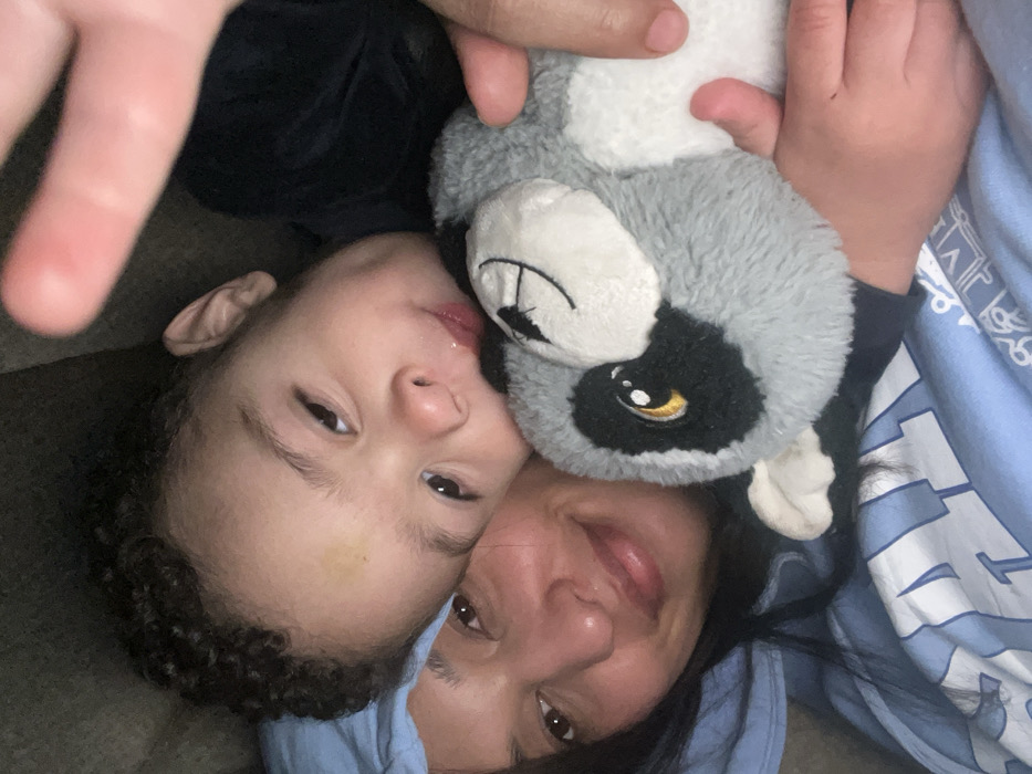 A close-up, slightly tilted shot shows a child and an adult lying close together. The child, with curly hair and a slight mark on their forehead, looks at the camera. Beside them, an adult also looks at the camera. Between them is a plush toy raccoon. The background includes a mix of blue fabric and a neutral-toned surface, possibly a couch. A hand, presumably taking the picture, is partially visible in the upper left corner.