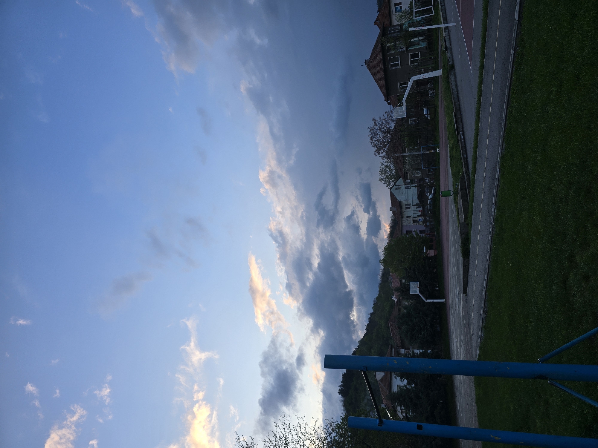 The image depicts a cityscape under a partly cloudy sky. The scene includes residential buildings, trees, and a section of a sports field, possibly a basketball court or similar recreational area, situated along a road or pathway. In the foreground, a blue metal structure, possibly a piece of playground equipment or construction material, is partially visible. Without additional information or context, it is difficult to pinpoint the exact location of this scene in Berkovitsa, Bulgaria. However, the presence of houses, a road, a sports field, and the surrounding trees suggest a residential area with recreational facilities. The cloudy sky gives a sense of variable weather conditions.