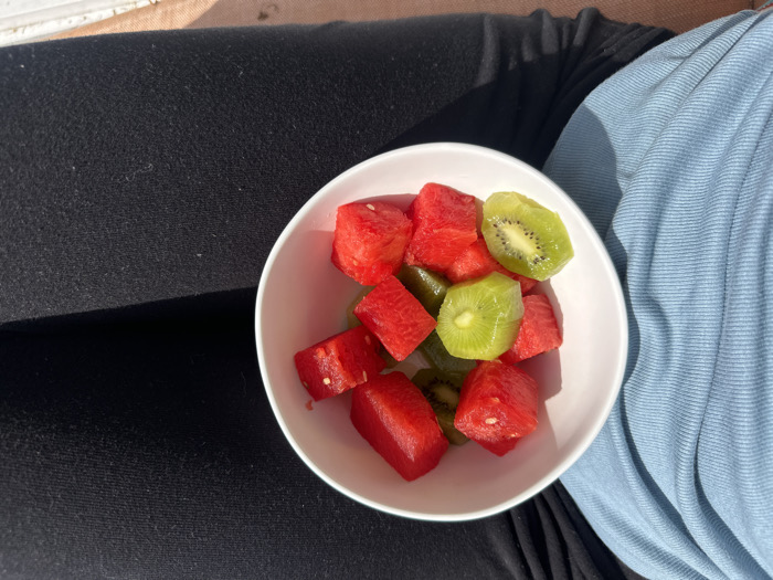 A white bowl containing diced fruit rests on a person's lap. The bowl holds cubes of red watermelon, some exhibiting small black seeds, and slices of bright green kiwi with central black seeds. The person's left upper leg is covered by light blue, ribbed fabric, while the right upper leg is covered by dark, likely black, textured fabric. Direct sunlight illuminates the scene, casting distinct shadows on the dark fabric. A small segment of light-toned skin is visible at the bottom center of the frame, between the two fabric types. The location in the city of Los Angeles, United States of America, is indeterminable from the image data.