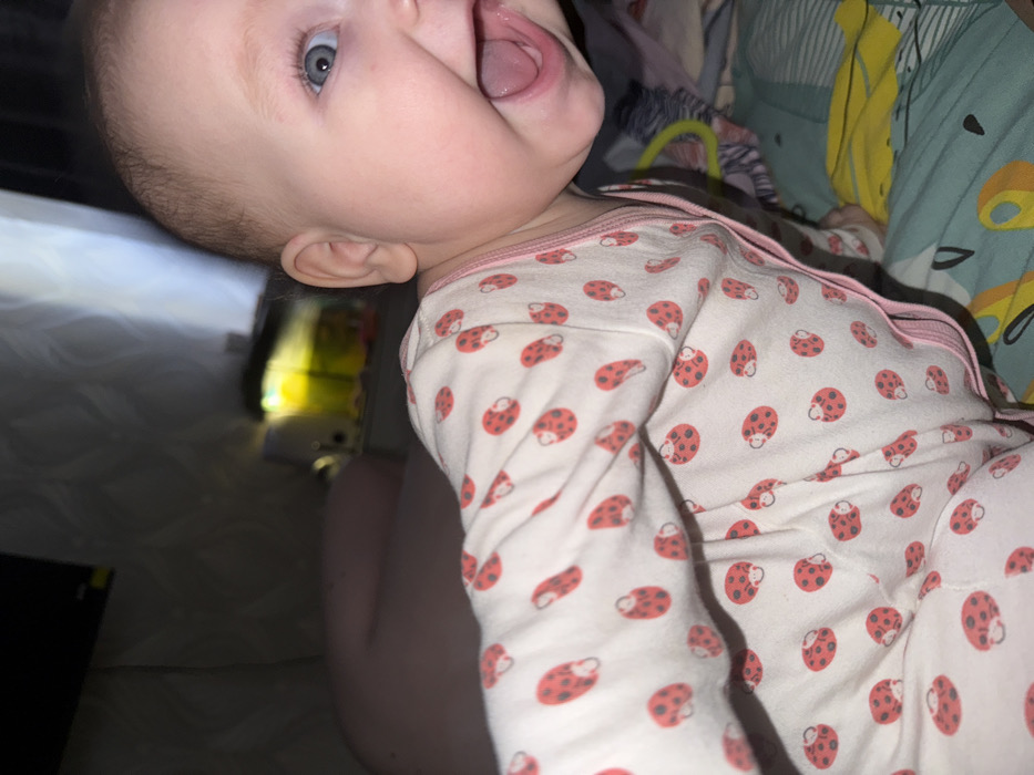 A baby with blue eyes and an open mouth wears a white pajama top with a ladybug pattern. The pajama has pink trim. The baby is lying on a surface. In the background are patterned fabrics in shades of yellow, blue, and green. A small, dark object and a partially visible bottle or container are in the lower left of the frame. The lighting is dim.