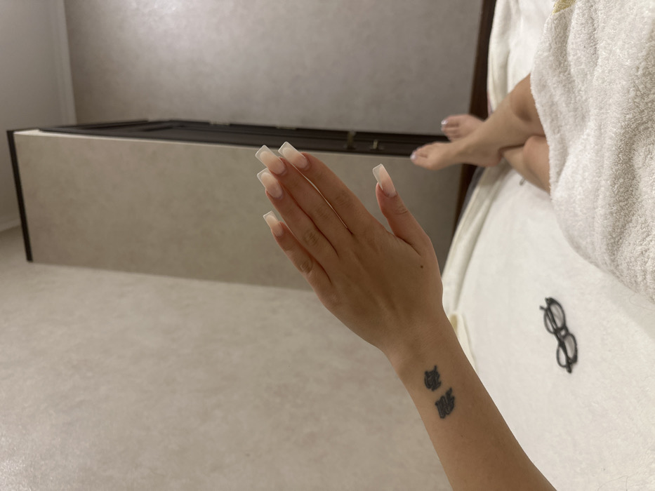 An extended arm and hand with manicured, long square nails is in focus. The forearm displays a small, black tattoo. Background details include a tan-colored surface, a raised platform, and a white robe with a black eyeglasses logo. Bare feet rest near the robe.