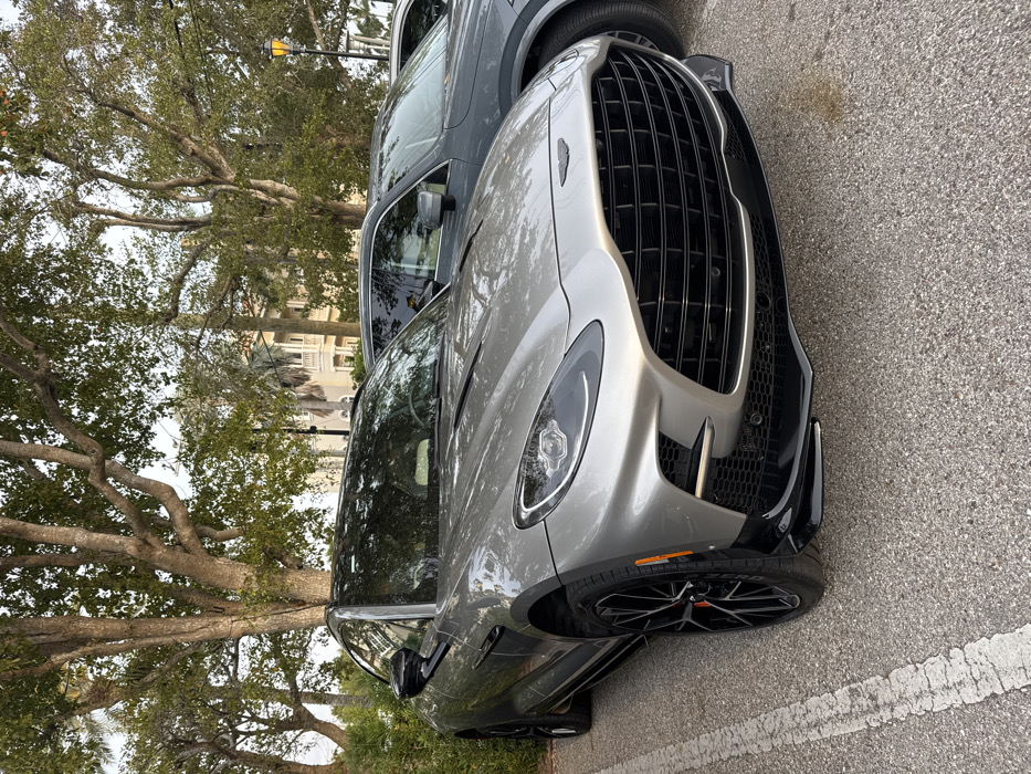 A silver Aston Martin DBX luxury SUV is parked at an angle in a paved parking lot in Naples, Florida, United States of America