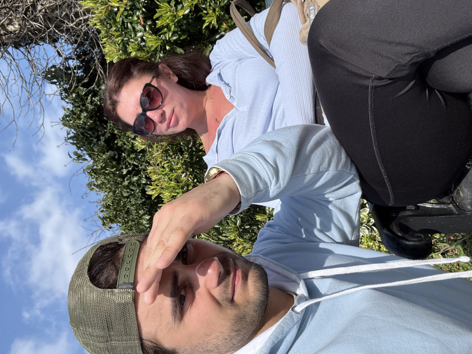 Two individuals, a male and a female, are seated on a black metal park bench in an outdoor setting within Kenilworth, United Kingdom. The male, positioned on the left and closer to the viewer, is young, wearing an olive green mesh-back baseball cap, a light blue hooded sweatshirt, and a gold-colored watch on his left wrist. He holds his right hand up, shading his eyes from direct sunlight, and looks forward. The female, seated to his right and slightly behind him, is wearing dark sunglasses, a light blue ribbed long-sleeve top, and black leggings. Her arms are crossed, and she looks towards her right. A light brown shoulder bag rests beside her. The background consists of dense green foliage and some bare tree branches under a clear blue sky with scattered white clouds. Strong natural light illuminates the scene, creating distinct shadows.