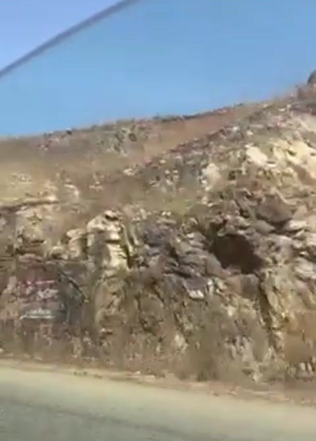 view from inside a moving vehicle traveling along a road next to a rocky hillside. The hillside is composed of large rocks and some sparse vegetation. The sky is clear and blue. There are no people visible. The only sound is of the vehicle moving.