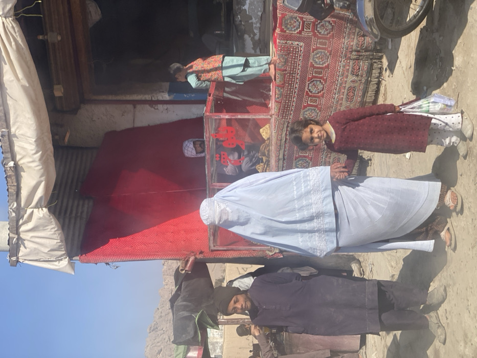 A family stands outside a building. A woman wearing a light blue burqa stands beside a girl in a maroon dress. A man in a dark outfit stands slightly in front. A boy in a light green outfit stands near the entrance. A red rug adorns the building's side. Another man wearing a white head covering peers out from behind a red panel near a glass case with red writing.