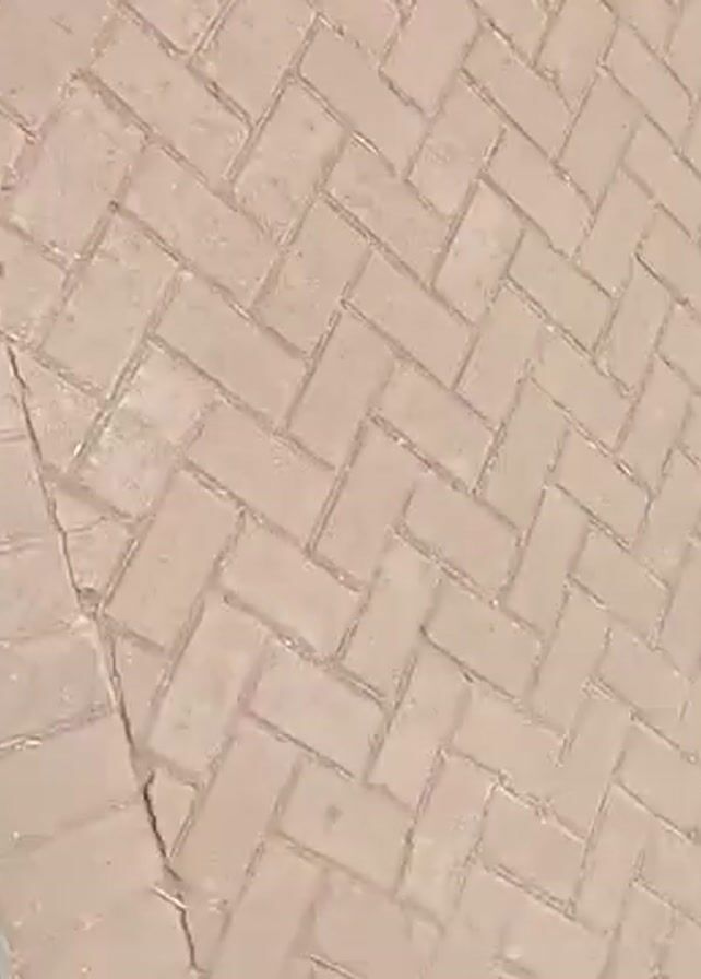 first-person perspective of someone standing on a gray metal surface next to a brick pathway. The person is wearing white shoes and dark pants. The camera angle focuses downwards, showing the feet and the surfaces they are standing on. The brick pathway is made of rectangular bricks laid in a herringbone pattern. The video appears to be taken in an outdoor setting during daytime.