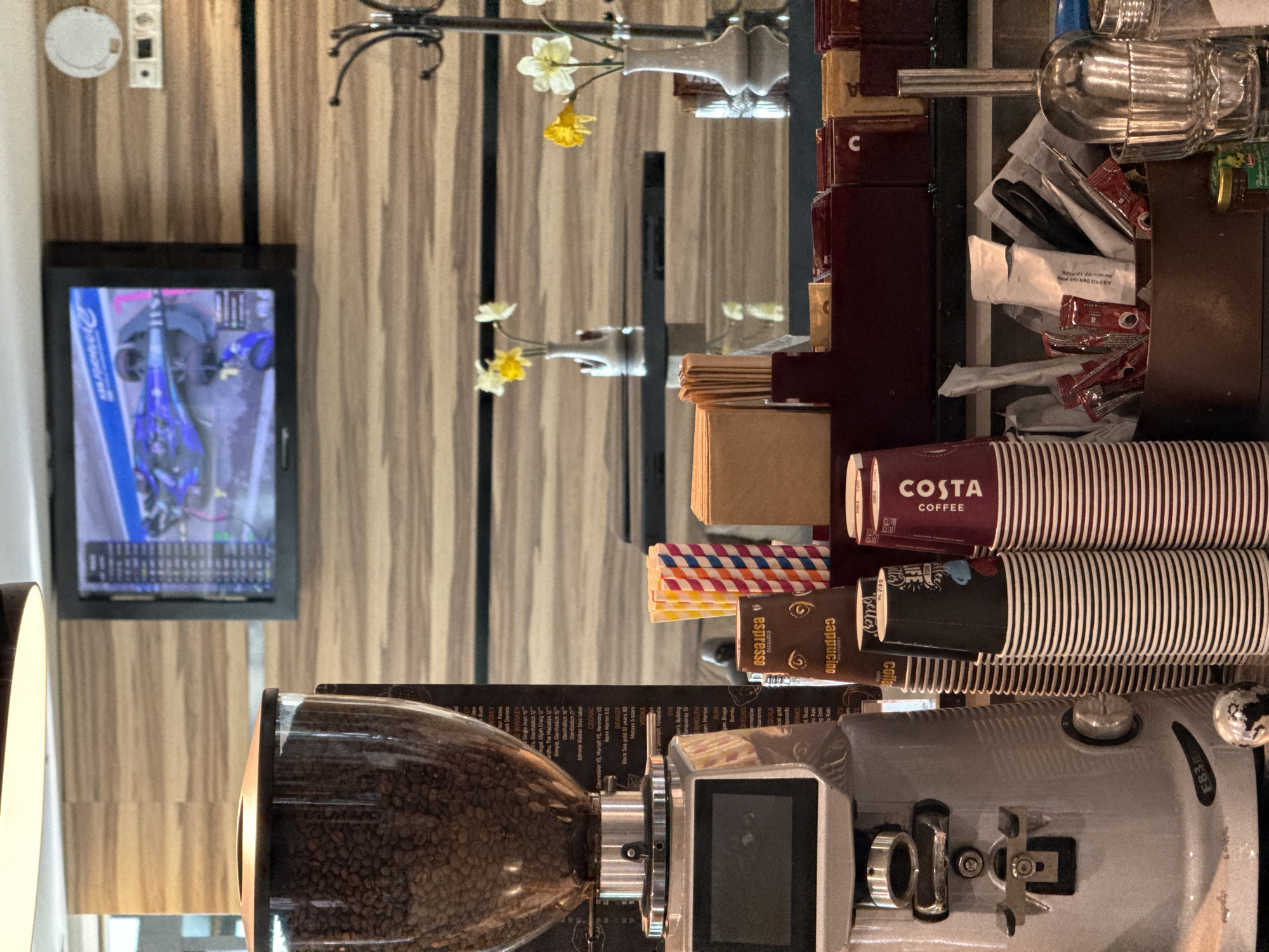 The scene depicts an interior view of a Costa Coffee establishment in Varna, Bulgaria. In the left foreground, a silver industrial coffee bean grinder, model F83E, stands prominently with a clear hopper filled with dark roasted coffee beans. A menu or price list is partially visible behind the grinder. To the right, the counter area displays stacks of disposable coffee cups, including burgundy and white striped cups bearing the "COSTA COFFEE" logo, as well as black and white striped cups and brown cups labeled "espresso" and "cappuccino." A holder contains colorful striped straws, and another compartment holds brown paper napkins. A bin is filled with individual sugar packets, stirrers, and small plastic spoons. A metal scoop and several glasses are also visible on the counter. In the mid-ground, a flat-screen television is mounted on a wall featuring horizontal wooden paneling. The screen displays a motor racing event, showing a blue and purple racing car on a track with on-screen data. Below the television, two small, dark, reflective tables are present, each holding a white ceramic vase containing yellow and white daffodils. An electrical outlet and a white circular fixture are visible on the wall to the right of the television. A black metal coat rack with multiple hooks is situated on the far right. The overall setting is a functional coffee preparation and serving area within a casual cafe environment.
