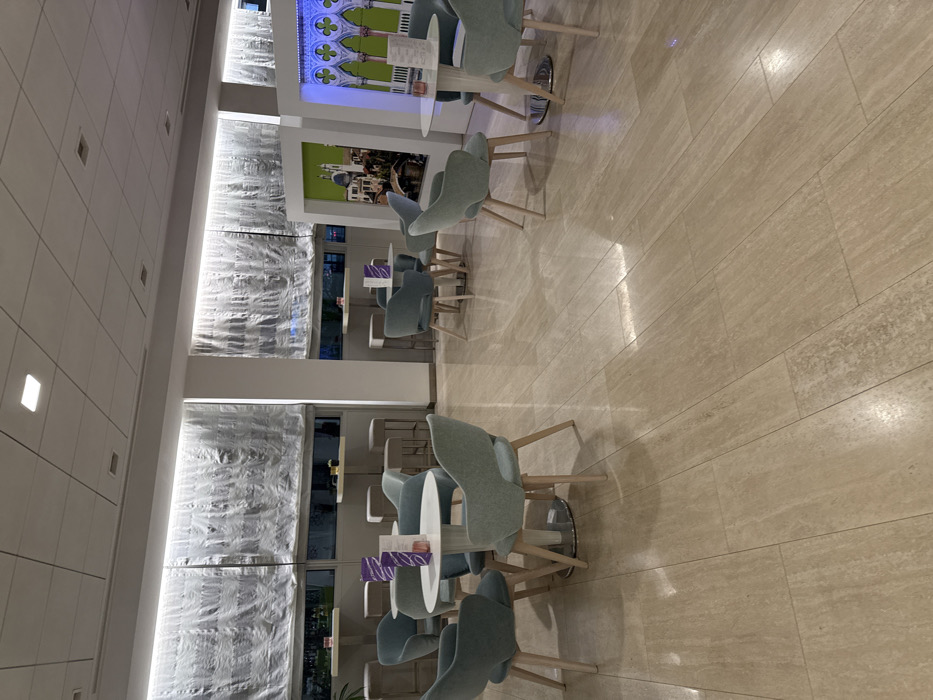 The image displays a cafe interior, focused on seating arrangements. Tables and chairs with light blue upholstery are arranged along a wall with covered windows. A wide corridor is between the seating and the floor is made of light beige rectangular tiles. Artwork depicting Venetian scenes adorns the upper portion of the wall, adding a decorative element to the space.