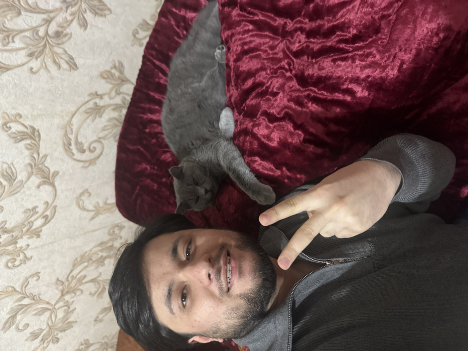 An indoor scene in Fergana, Uzbekistan, depicts a male subject and a cat