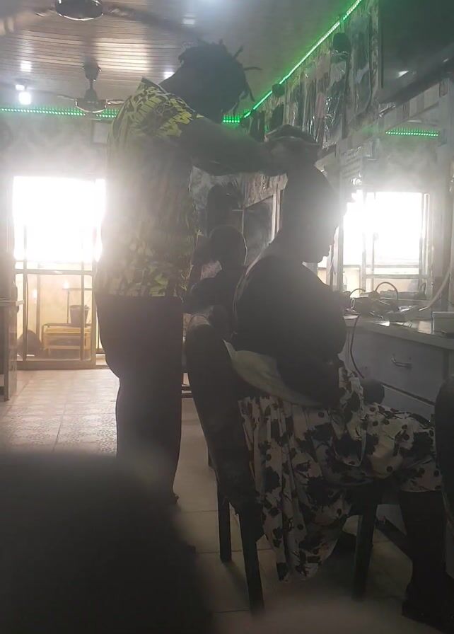 two people sitting in chairs in a brightly lit indoor space. The person on the left is standing and leaning towards the person seated on the right, possibly interacting or providing assistance. The environment appears to be a store or shop, with merchandise displayed on shelves behind the people. The interior has a tiled floor, and ceiling with a fan and green LED lighting. The video is vertically oriented and appears to have been taken indoors.