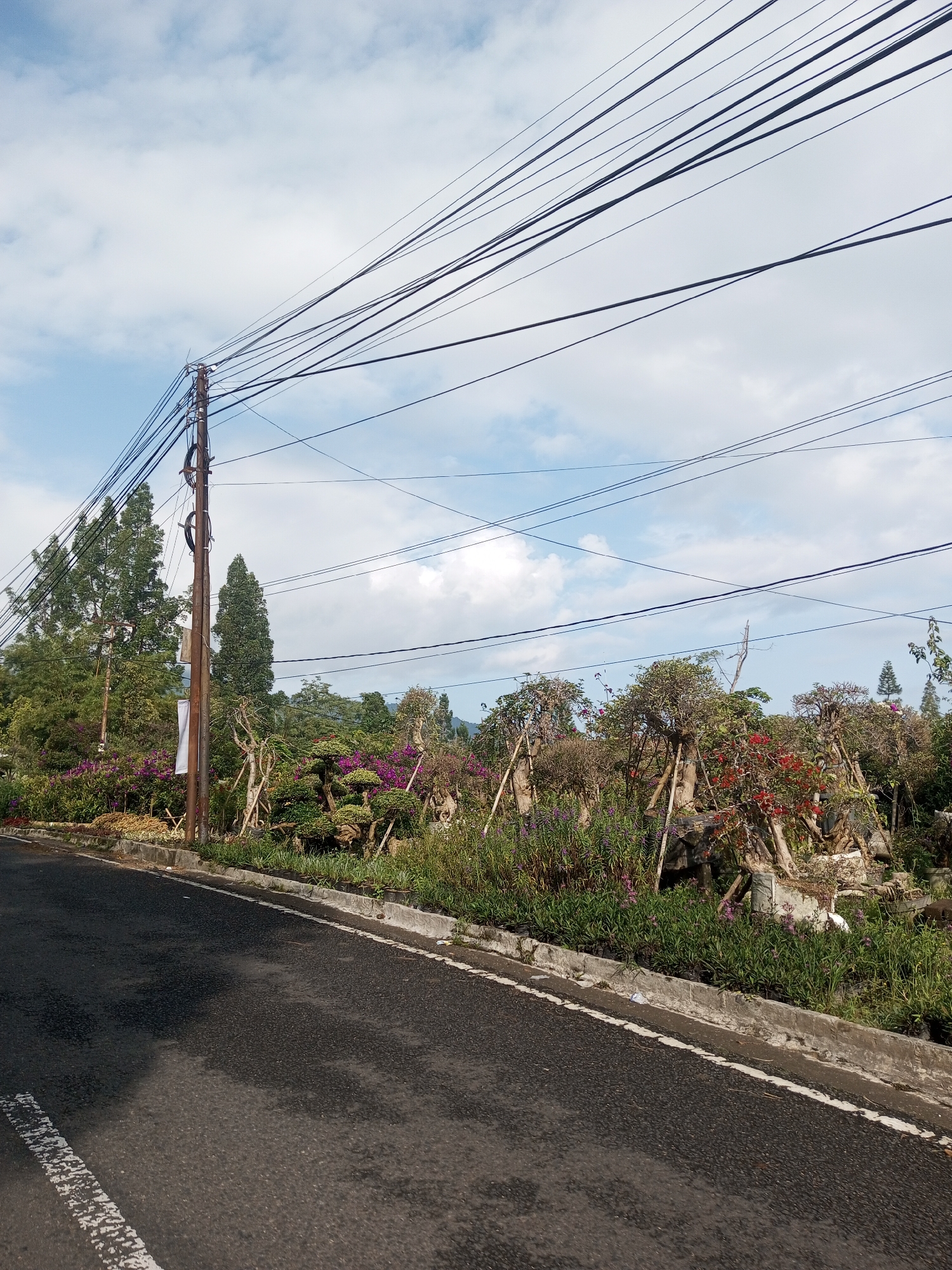 section of road in Mya Sit Kaing Ywar Thit, Myanmar. An asphalt road with a white edge line runs along the bottom of the frame. A concrete curb separates the road from a roadside garden containing flowering plants and small trees. A utility pole stands on the garden side of the curb, with numerous electrical wires stretching across the upper portion of the image against a sky with scattered clouds.