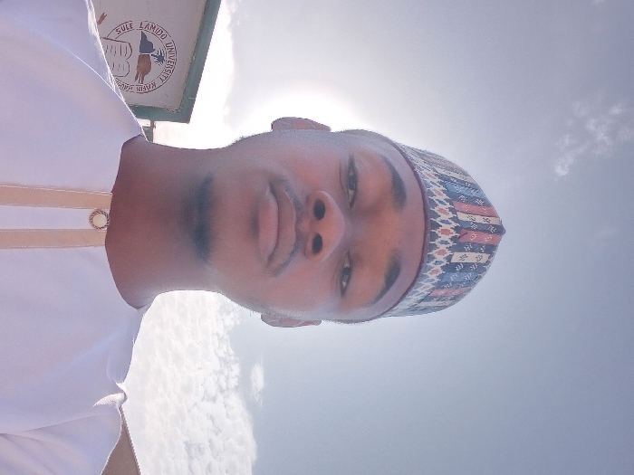 A young male individual is positioned in the foreground, facing directly towards the camera, against a brightly lit outdoor background in Kwazailewa, Nigeria