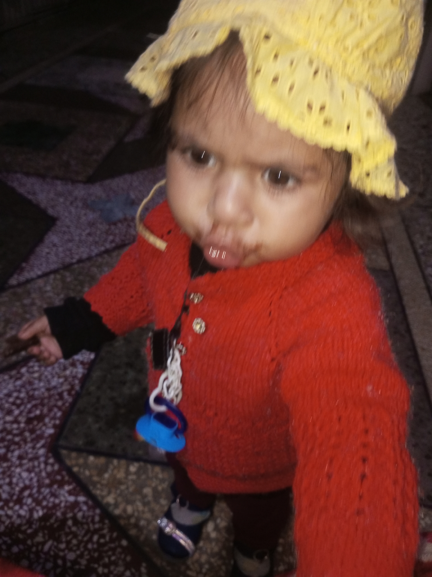 A baby is shown indoors in Mansehra, Pakistan. The baby wears a yellow bonnet, a red sweater with black sleeves, and dark trousers. A pair of baby shoes hang from the sweater. The baby's mouth appears wet. The floor is covered with patterned tiles.