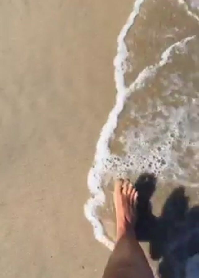 A person wearing a red dress with white floral patterns walks barefoot on a sandy beach into the ocean