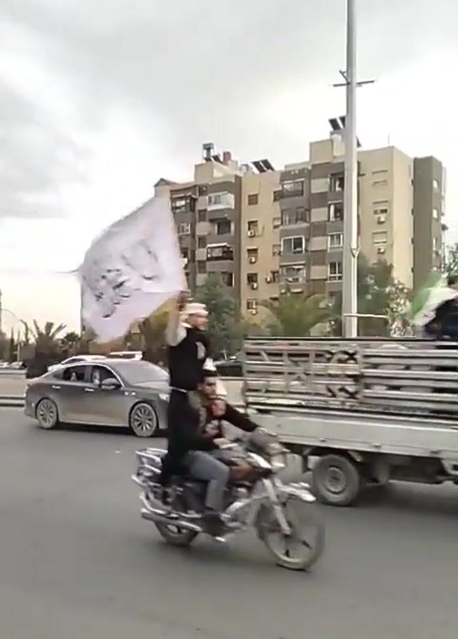 street scene in what appears to be an urban area. Several multistory apartment buildings line the background under a cloudy sky. The street is active with vehicles. Initially, a small truck with people on top and a motorcyclist pass by. Following this, a convoy of cars drives through, some decorated with green and white flags. A man stands on the side of the road, observing the passing vehicles with his arms crossed. The general impression is a celebratory or festive atmosphere with the vehicular procession.