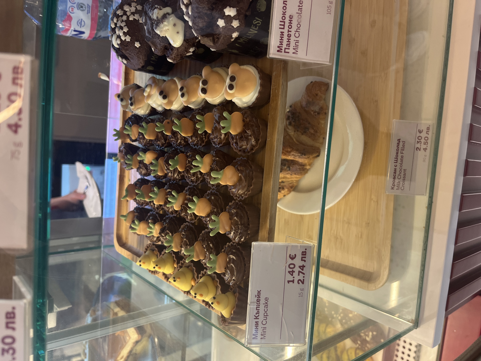 The image depicts a display case in what appears to be a bakery or pastry shop. Inside the case, there's an assortment of baked goods arranged on a wooden tray. From top to bottom, there are chocolate muffins with white star decorations, cupcakes decorated to resemble bears, cupcakes decorated with carrots and cupcakes decorated to look like baby chicks. A croissant rests on a white plate. Signage is present, indicating prices in both Euros (€) and Bulgarian Leva (лв). The “Мини Къпкейк/Mini Cupcake” is priced at 1.40€ or 2.74 лв., the "Кроасан с Шоколад/Milk Chocolate Filled Croissant" at 2.30€ or 4.50 лв., and the "Мини Шокол Панетоне/Mini Chocolate" is 105g. The scene suggests a location in Plovdiv, Bulgaria, based on the use of the Bulgarian language on the price tags. A person is visible in the reflection in the display case.