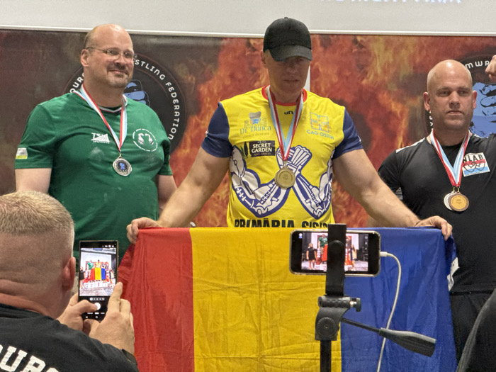 Three men stand on a podium draped with the Romanian flag, wearing medals. The man in the center wears a yellow shirt with arm-wrestling imagery and two gold medals. To his left, a man in a green shirt wears a silver medal. To his right, a man in a black and white shirt wears a bronze medal. A man in the foreground uses his phone to take a picture, while another phone on a tripod records a video. The backdrop features wrestling-related logos and a fiery design.
