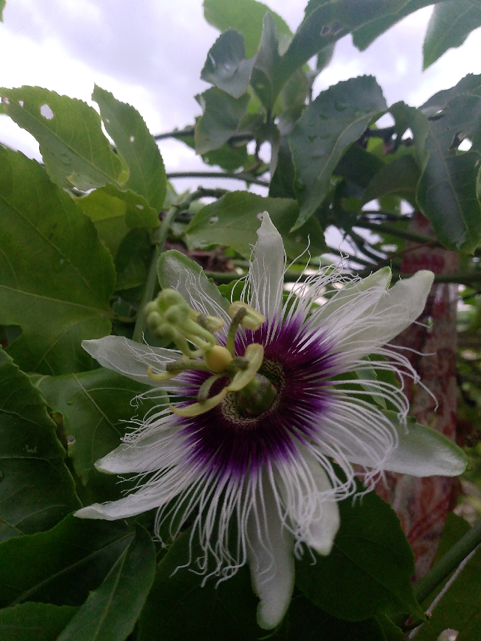 A vibrant passion flower with white petals and a striking purple center is surrounded by lush green leaves. The flower showcases delicate, fringed filaments radiating outwards. The leaves, some displaying water droplets and minor insect damage, create a dense backdrop. A cluster of green buds is visible near the flower's center. The sky appears overcast, suggesting a cloudy day. The composition captures the intricate beauty of the passion flower amidst its natural environment.