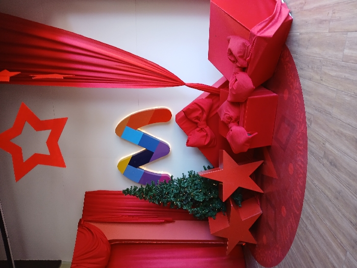 This image depicts an indoor festive display located in the city of Pampatar, Venezuela. The scene features a light-colored wall with a prominent, colorful "M" logo at its center, composed of segmented, illuminated panels in shades of blue, purple, yellow, orange, and red. Above the logo, a large, hollow red star is mounted on the wall. To the left, red fabric drapes are arranged in a swag pattern, extending downwards. A vertical strip of similar red fabric hangs from the upper right corner of the wall. The floor is covered with light-toned wooden planks. A large, circular red mat with subtle patterns, including repeated "Merry Christmas" text and small stars, is laid on the wooden floor. On this mat, an artificial green Christmas tree, sparsely decorated with small white lights, stands towards the left. Two large, three-dimensional red star props are positioned on the mat near the base of the tree. To the right of the tree, several red, box-like structures are arranged; one prominent red box features a large red fabric bow. Additional smaller red blocks or fabric-wrapped items are placed on and around these larger red structures, with another large, rectangular red box leaning towards the right side of the frame. No individuals are present in the scene.