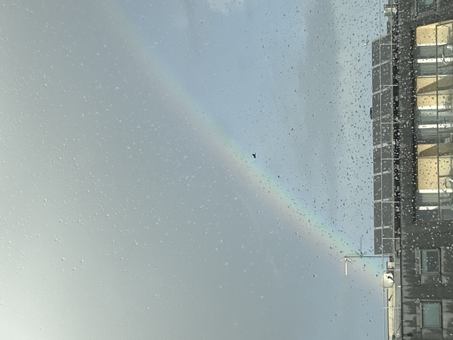 The image depicts an outdoor urban scene in Strasbourg, France, viewed through a pane of glass heavily speckled with raindrops. The upper two-thirds of the frame show an overcast, light grey-blue sky featuring a prominent rainbow arcing from the lower-left to the upper-right. A small, dark, V-shaped object, consistent with a bird in flight, is visible as a silhouette against the sky within the rainbow's arc. The lower third of the image is occupied by a dark-colored, multi-story building. Its flat roof is equipped with numerous dark, rectangular solar panels arranged in rows and a white, pole-like structure, possibly a lamppost or antenna, on the left side. A thin metal railing runs along the roof's perimeter. The building's facade below the roofline displays several reflective, rectangular windows.