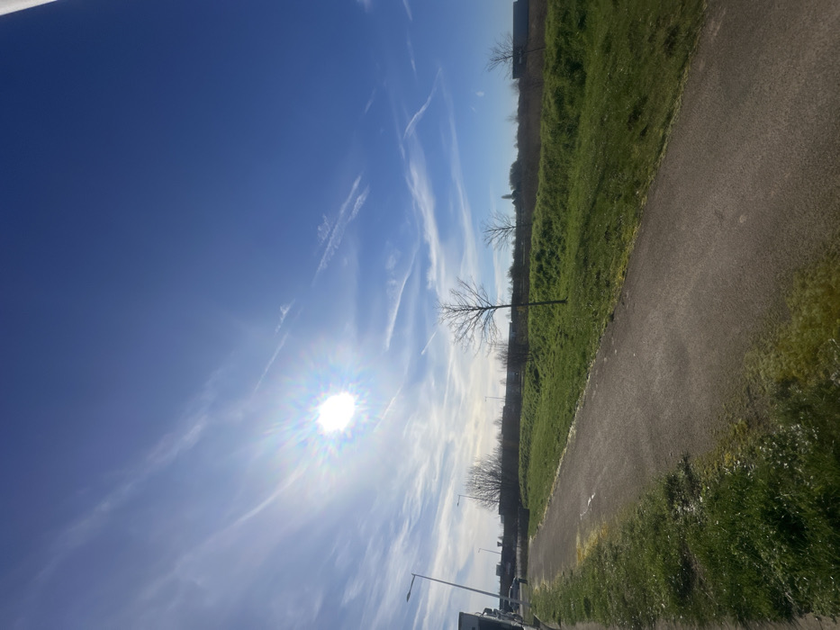 This image depicts an outdoor daytime scene in Lambres-lez-Douai, France, under a clear blue sky with sparse, wispy cirrus clouds. The sun is prominently featured in the upper left quadrant, exhibiting a bright lens flare effect with radial light streaks. In the foreground, a dark gray asphalt path, approximately 2-3 meters wide, extends from the lower left towards the center and slightly right, curving subtly. The path shows some light-colored discoloration, possibly moss or lichen growth, particularly along its edges. Green grass with some bare patches borders the path on both sides. The midground features an expanse of green grass covering uneven terrain. Scattered within this area are several deciduous trees with bare branches, indicative of late autumn or winter. A single, relatively young, slender tree stands centrally in the midground, to the right of the path. In the background, on the left, a light-colored building structure is partially visible. Further back, a line of indistinguishable industrial or commercial buildings with dark roofs and walls extends horizontally across the scene. Multiple streetlights with slender poles are visible along the edge of the background structures. Distant vegetation, mostly bare trees, is also visible, and a faint silhouette of a distant building or structure with a pitched roof is discernible on the horizon towards the right. No individuals or specific actions are visible in the scene. The lighting indicates direct sunlight, casting subtle shadows to the right.