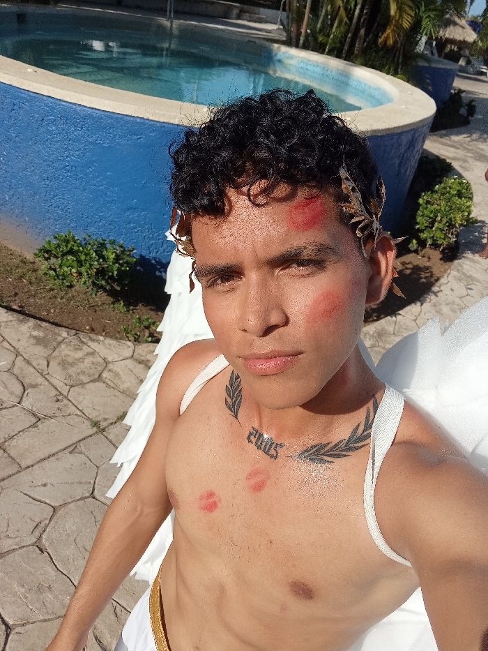 A young man poses in a shirtless cupid-like costume, including white wings, a gold belt, and a leaf crown. He has red makeup on his cheek and forehead, plus two lipstick marks on his chest. A prominent tattoo adorns his chest with a date and leafy designs. He stands outside, likely poolside, with a turquoise pool and greenery in the background. The patio is paved with tan stones.