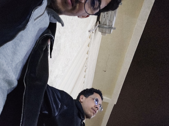 Two males are present in a low-angle, close-up shot, positioned against a light-colored, ridged building wall. The specific location within the city of Fez, Morocco, is not discernible from the visual evidence provided. In the foreground, on the left, a male is partially visible from his nose to his chest. He wears dark-rimmed glasses and has a mustache. He is dressed in a grey quarter-zip top layered under a dark, possibly black, zipped jacket. His face is oriented directly towards the camera. In the background, on the right, a second male is partially visible from his upper chest to the top of his head. He wears round, silver-framed sunglasses with light blue-tinted lenses and a dark jacket. His head is tilted upwards and to the right, with his gaze directed away from the camera. Mounted on the wall behind the individuals, slightly to the left, is a white outdoor air conditioning condenser unit. Above the visible wall, the upper portion of the image is uniformly dark, suggesting a low-light environment, possibly a dark ceiling or the night sky.