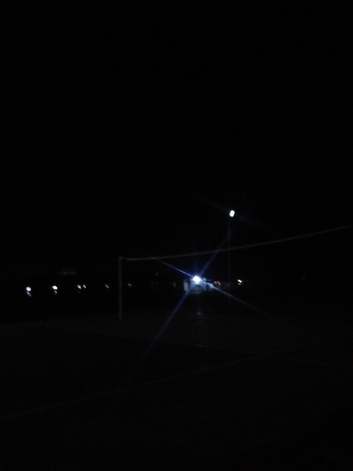 A dark, night image shows a blurred scene. A volleyball net is visible with a streetlight nearby, causing a glare. Dim lights appear in the distance, possibly from buildings or other light sources. The ground is indistinguishable, blending into the darkness. The overall atmosphere is dim and obscured.