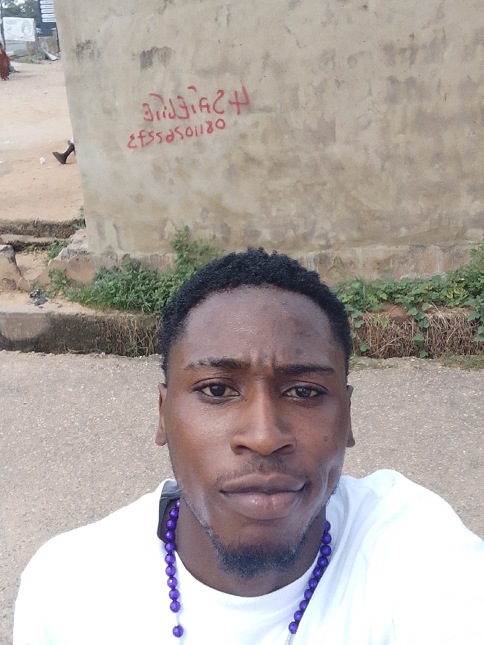 An adult male with dark skin, short dark curly hair, and a thin beard is depicted in a close-up, chest-up shot