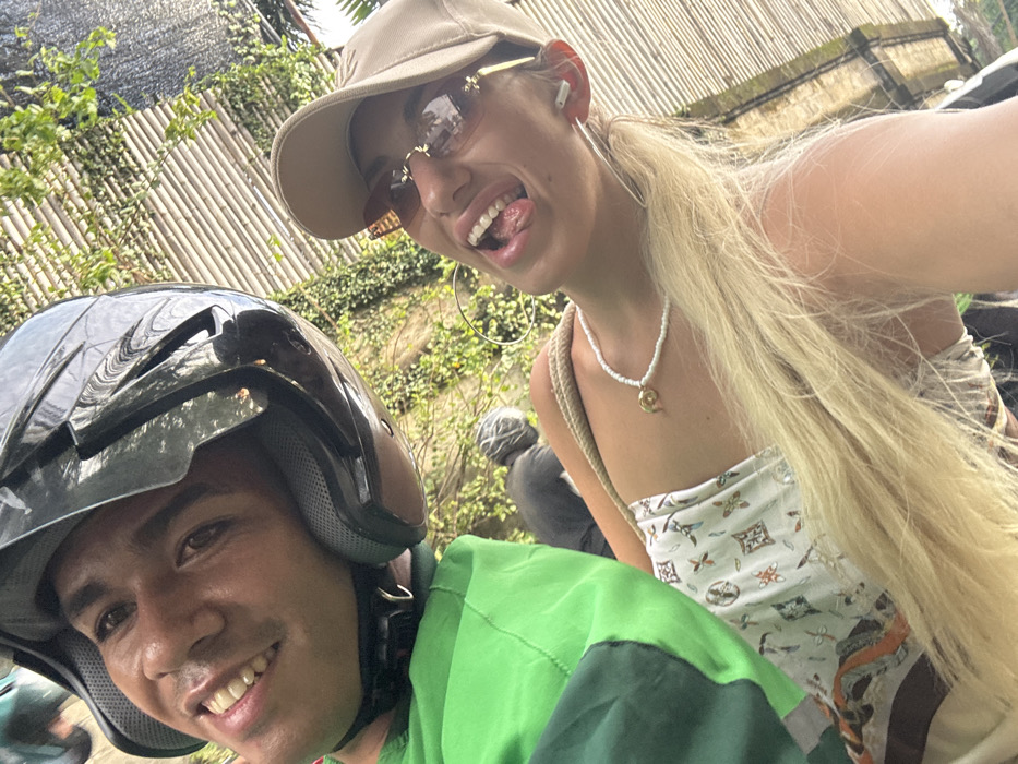 The image displays two individuals, apparently on a motorized vehicle, in Tibubeneng, Indonesia. The person positioned on the left is a male with a dark complexion, wearing a bright green long-sleeved shirt and a black open-face motorcycle helmet, secured with a chin strap. He is smiling and looking directly at the camera. The person on the right is a female with fair complexion and long blonde hair styled in a ponytail, wearing a beige baseball cap, rimless brown-tinted sunglasses with gold-colored accents, and large silver hoop earrings. She wears a white strapless top featuring a light-colored patterned design, a white beaded necklace with a small gold-colored pendant, and a white wireless earbud in her right ear. Her mouth is open, with her tongue extended, and she is also looking directly at the camera. In the background, behind the female, a third individual wearing a dark helmet and dark clothing is partially visible. The environment includes green foliage on the left and center, and a structure composed of horizontal light-colored slats on the right, suggesting an outdoor setting under daylight.