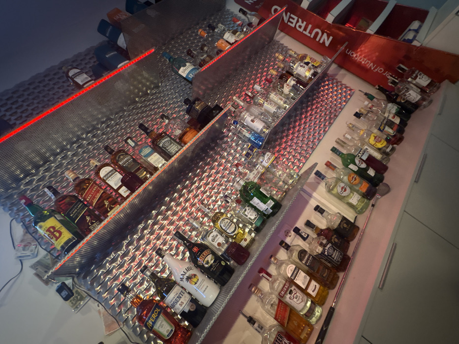 This image captures an interior view of a commercial establishment, likely a bar or nightclub, located in Sofia, Bulgaria. The central focus is a multi-tiered display of various alcoholic spirits. The scene features three primary shelves constructed from shiny, diamond-plate textured metal, illuminated from beneath by prominent red LED strip lighting. This lighting casts a crimson glow across the bottles and the metallic surfaces, contributing to a modern, vibrant aesthetic. On the shelves, numerous bottles of well-known international spirit brands are meticulously arranged. Visible brands include Aperol, Absinthe, Malibu, Baileys, Corona (though appearing as a spirit bottle here, likely a mixer or specific Corona spirit), Tequila (specific brand unclear), Johnnie Walker (Black Label and Red Label), Bushmills Irish Whiskey, Jack Daniel's Tennessee Whiskey, Smirnoff Vodka, Gordon's Gin, Martini (various types), and Campari. Several empty clear glass bottles, typically used for pouring or as decorative elements, are also present on the lowest shelf. In the upper-left corner, on the top shelf, several folded banknotes are visible, though their specific denomination or currency cannot be definitively identified. To the right side of the image, a vertical red banner with white text is partially visible. The text clearly reads "NUTREND" followed by "Power of Nutrition," indicating a promotional display for a sports nutrition and supplement brand. The environment is indoors, characterized by clean lines and the distinctive metallic shelving. No individuals are present in the frame, and no specific actions or interactions are depicted. The scene is static and presents a fully stocked bar display.