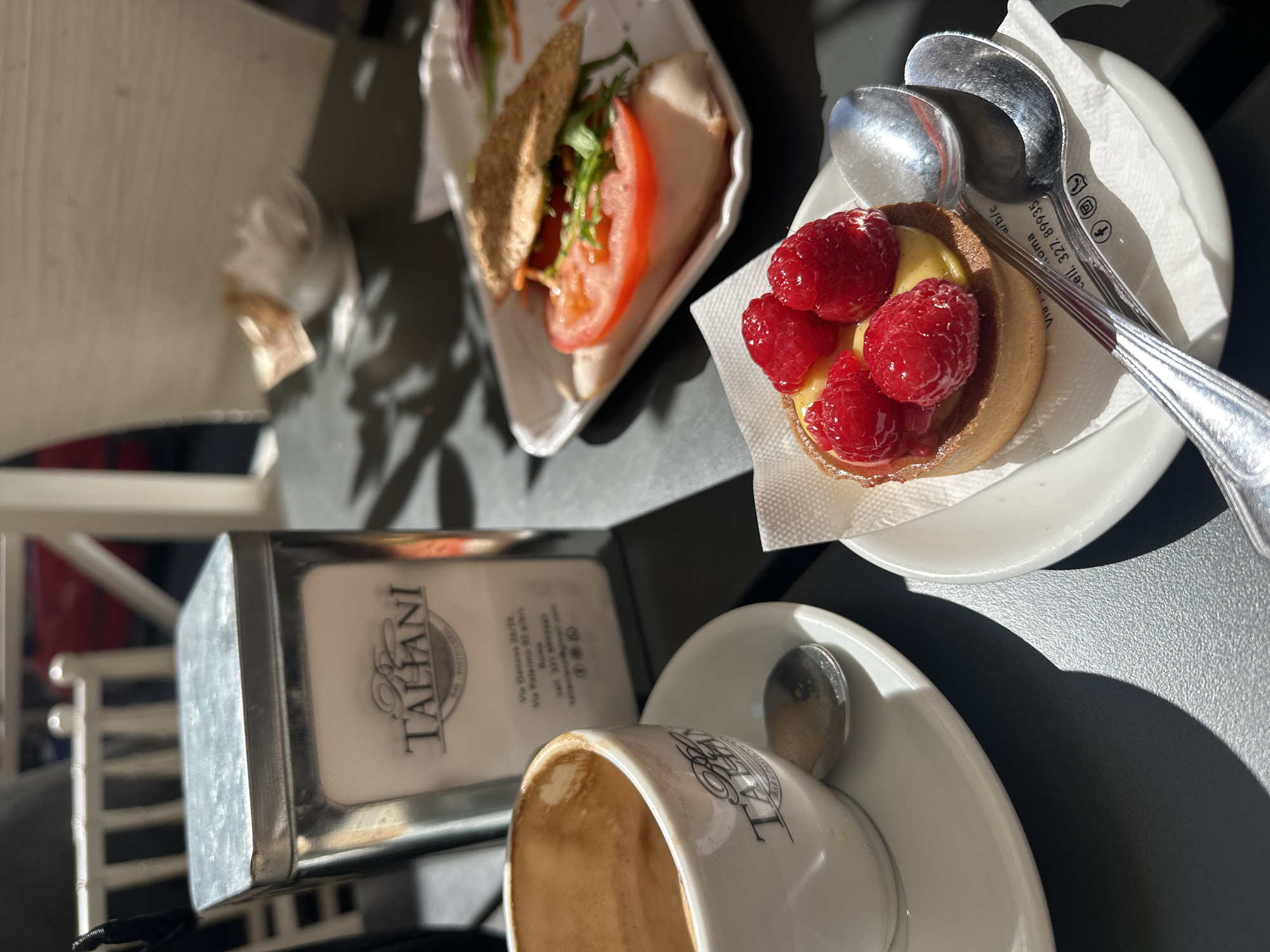 The scene depicts an outdoor cafe table at Taliani Bar - Pasticceria, located in Rome, Italy, with addresses Via Genova 24/26 and Via Palermo 37 a/b/c visible on a napkin dispenser. On the dark grey, textured table surface, a partially consumed espresso in a white cup with the "TALIANI" logo rests on a matching saucer alongside a small spoon. Behind the espresso, a square silver napkin dispenser displays the "TALIANI BAR - PASTICCERIA" branding and location details. In the foreground, a round tart topped with multiple red raspberries and a pale yellow custard filling is presented on a small white plate with two silver spoons. Further back on the table, a sandwich composed of a whole-wheat bun, a prominent slice of red tomato, green leafy vegetables, and light-colored deli meat is served on a rectangular white dish. Strong directional sunlight illuminates the right side of the table, casting distinct shadows of the objects. The background is blurred, showing white outdoor chairs and a red vehicle. No people are visible.
