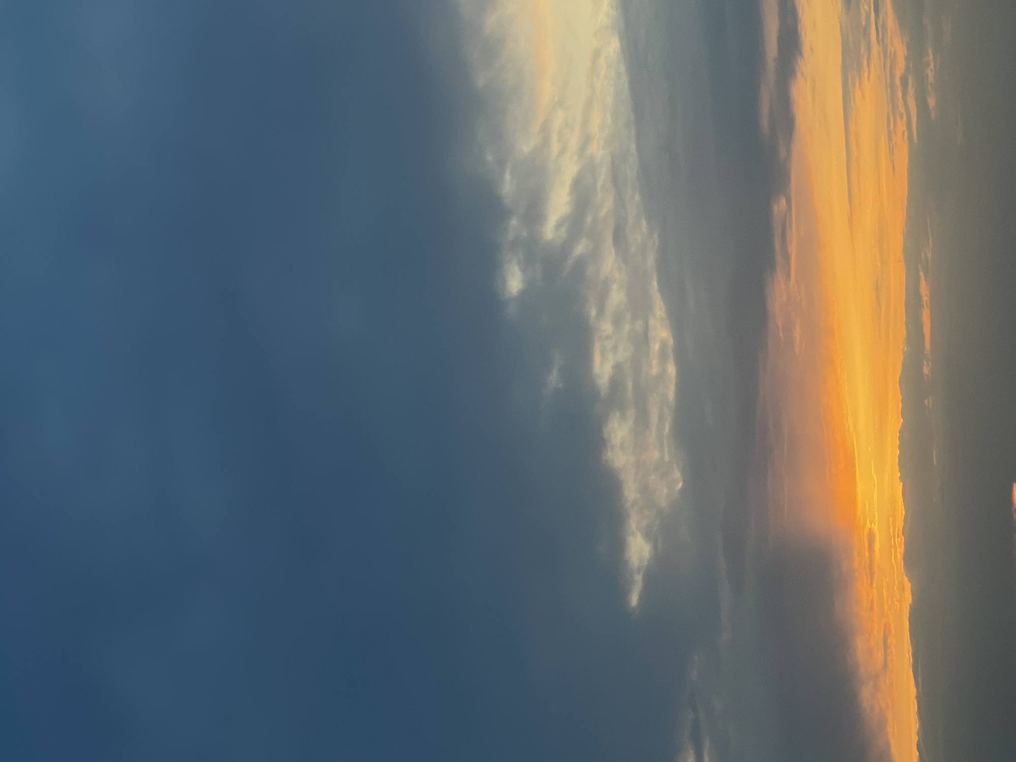 The image displays an atmospheric scene, consistent with either sunrise or sunset, over Novi Sad, Serbia. The upper two-thirds of the frame feature a dark blue-grey sky, gradually transitioning to lighter grey clouds across the mid-section. A prominent band of fragmented, light-toned clouds stretches diagonally from the upper right quadrant towards the center-left. The lower third of the image is characterized by an intense orange and yellow atmospheric glow, indicating the sun's position near or below the horizon. This vibrant lower segment is partially obscured by a horizontal layer of dark grey, undifferentiated clouds along the bottom edge of the frame. No terrestrial features, structures, individuals, or identifiable objects are visible within the frame; the scene consists solely of sky and cloud formations.