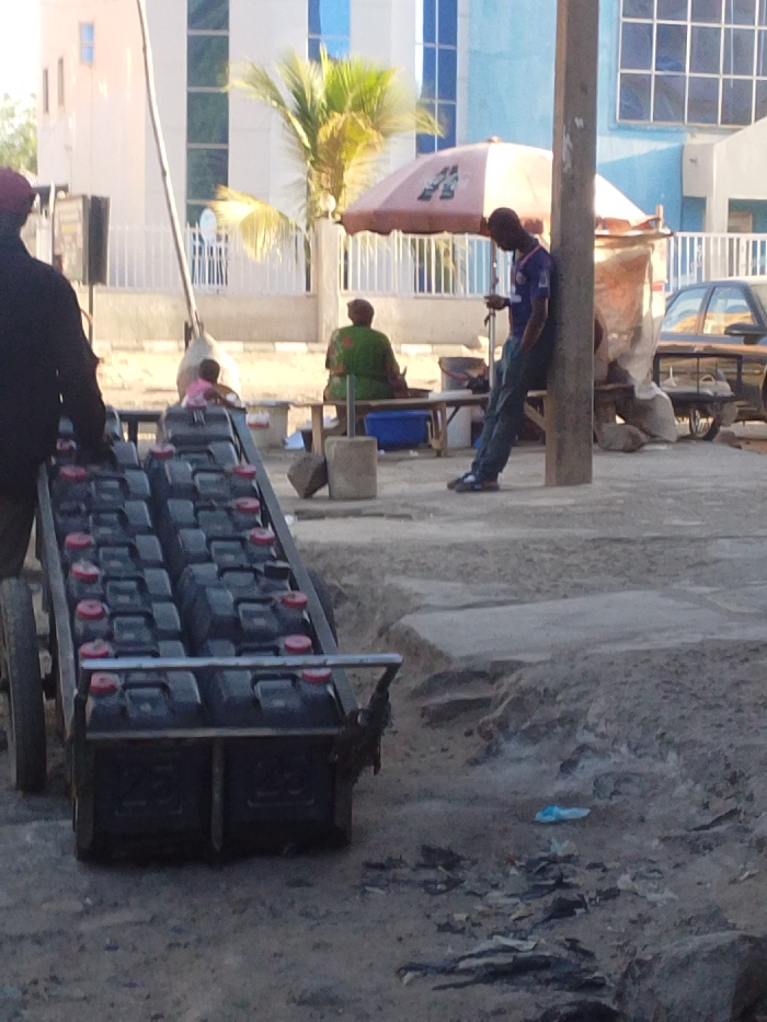 An outdoor urban scene in Sabon Gari East, Nigeria, captures a moment on an unpaved, dusty street. In the left foreground, a person, largely obscured from the chest down, pushes a two-wheeled utility cart. The cart is heavily laden with approximately 24 black jerrycans, each featuring a red cap, arranged in rows. In the mid-ground, slightly to the right, a man in a blue short-sleeved shirt and dark trousers leans against a dark utility pole, looking down at a mobile device held in his hands. To his left, an older woman wearing a green garment is seated on a wooden bench under a light-colored parasol, facing away from the viewer. A small individual, possibly a child in a pink top, is seated on a bench to the woman's left, partially visible. Various items, including a blue plastic tub and white buckets, are positioned around the seating area. A dark vehicle, possibly a car, is partially visible on the far right. The background features a multi-story building with white walls and distinctive blue reflective windows. A palm tree stands in front of this building. A white metal fence or railing runs horizontally across the mid-background. The ground throughout the visible area is uneven, unpaved, and shows scattered debris. The scene is illuminated by natural daylight, casting soft shadows.