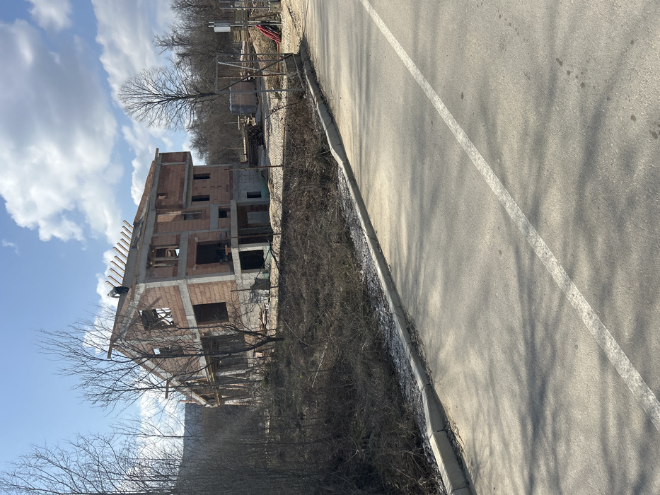 The image depicts an active construction site in Pravets, Bulgaria, observed from a paved road on a clear day with scattered clouds. In the midground, a multi-story house is under construction, featuring exposed red brick/block walls and a concrete frame. The roof structure is partially complete, with wooden trusses (rafters) in place but lacking exterior roofing material. One individual, wearing light-colored attire, is visible on the roof near the apex, engaged in work on the roof structure. The construction site is delimited by a chain-link fence in the foreground, behind which various construction materials, including stacks of lumber, are present. The immediate ground cover within the site and between the fence and the road consists of dry, dormant vegetation and sparse bushes. In the foreground, a two-lane asphalt road with a solid white center line is visible. A concrete curb separates the road from the unpaved verge. The background features numerous bare deciduous trees, indicative of late winter or early spring conditions, and distant rolling hills or mountains. Shadows are cast across the road surface, consistent with natural daylight.