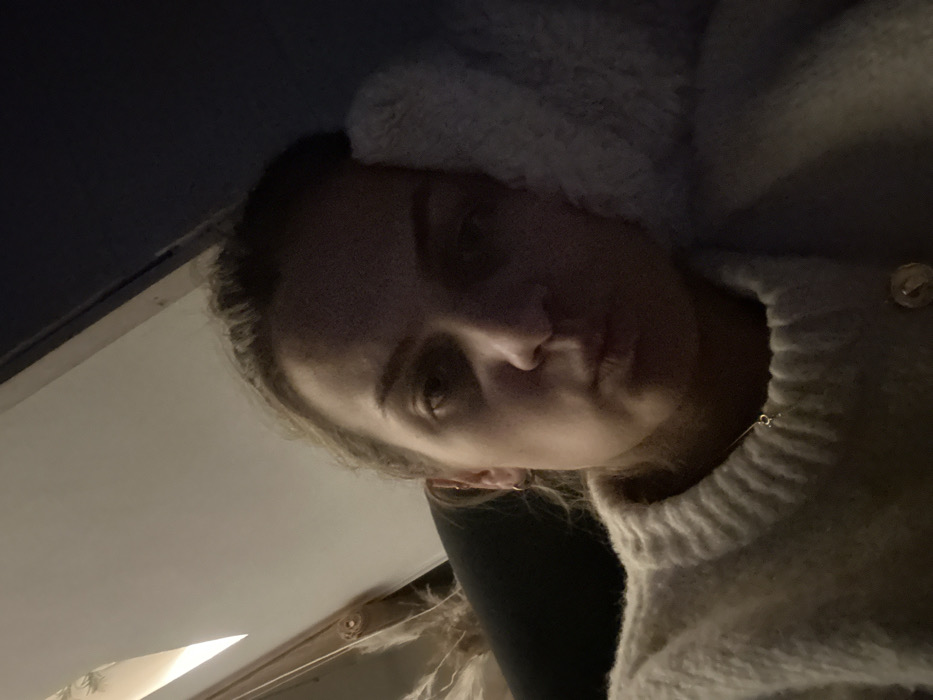A close-up selfie shows a fair-skinned woman in a slightly angled, low-light setting. She wears a cream-colored, high-necked sweater with a visible button. Her hair is pulled back, revealing small hoop earrings. The background is dark, with a faint outline of what appears to be a window or light source on the left. Her expression is neutral, and her gaze is directed toward the camera. The image is somewhat grainy due to the lighting conditions.
