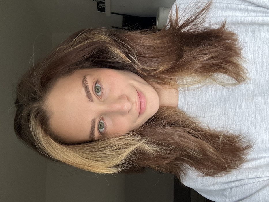 A female subject is depicted in a close-up, head-and-shoulders portrait, indoors, within a room in the city of Unknown, Unknown. The subject has fair skin, green eyes, and light brown hair with prominent blonde streaks, styled loosely and reaching past her shoulders. She is looking directly into the camera with a slight, closed-lip smile. She wears a light grey, heathered, crew-neck long-sleeved top. The background is dimly lit and out of focus. To the left, the background is uniformly dark. To the right, a partial view of a white structure, possibly a shelf or mantelpiece, is visible, with indistinct white and dark objects resting upon it. The lighting appears soft and even on the subject's face.