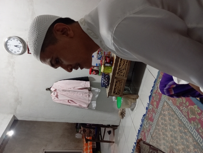 This is an interior scene located in Bulukandang, Indonesia. An adult male is seated in the right foreground, depicted in left profile. He wears a white knitted skullcap and a white long-sleeved shirt, with a purple sarong visible below. His mouth is slightly ajar. The floor is covered by a patterned rug on white tiles. In the midground, a carved wooden table holds multiple containers (red, yellow, dark blue) and a plastic water bottle. A light pink collared shirt and a dark garment hang on a wall hook behind the table. A round wall clock displaying approximately 12:35 is mounted on the upper wall. The background shows an open doorway to an adjacent room containing a chair and a table with an orange patterned cloth, illuminated by an exposed bulb. A green bucket is on the tiled floor near the wooden table. The walls are light-colored with visible staining.