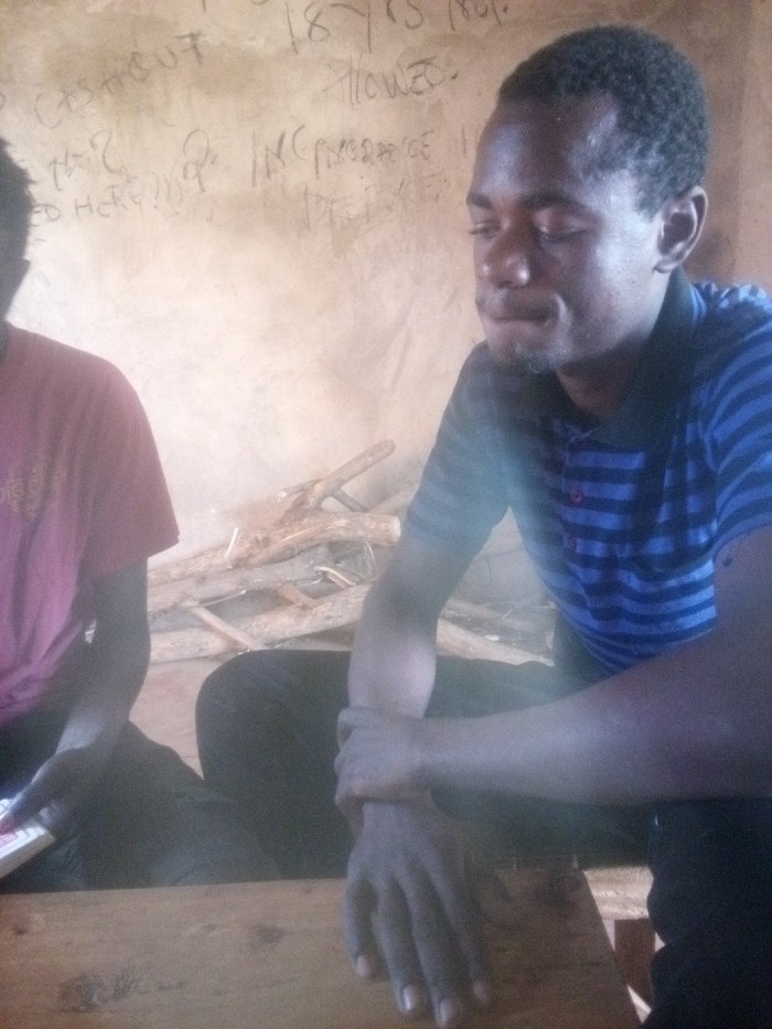 The scene depicts two individuals seated indoors within Getenga ward, Kenya. On the right, a dark-skinned male with short, dark hair wears a blue and black striped polo shirt and dark trousers. He is seated at a wooden surface, with his left hand gripping his right forearm, and his gaze directed downwards with eyes partially closed. To his left, partially visible, a second dark-skinned male wears a red short-sleeved t-shirt and dark trousers. His left hand rests on a small white object, possibly a book or device, on the same wooden surface. In the background, a light-colored wall features handwritten text, including partially discernible words like "CASTOUT," "18 YRS," "ALLOWED," "INC INSURANCE," and "DEFECTS." Scattered wooden sticks and debris are visible on the floor behind the subjects. Both individuals appear seated, facing roughly the same direction or each other across the wooden surface.