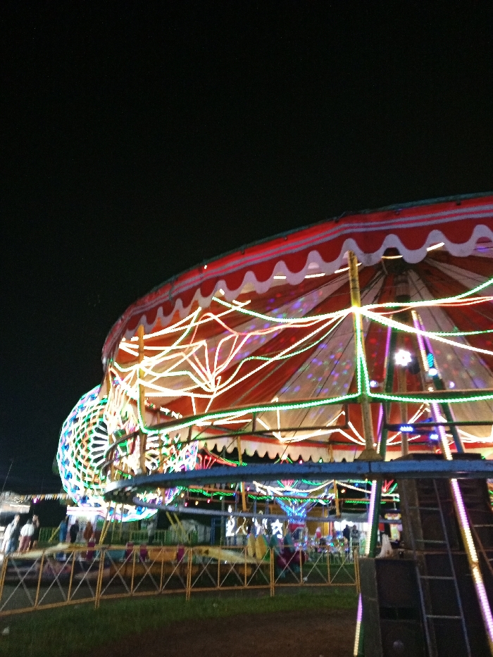 The image captures a nighttime carnival scene with vibrant attractions