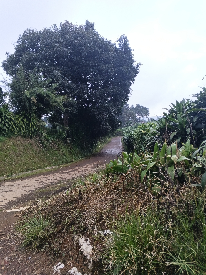 A narrow, dirt road curves between lush green vegetation and a dense tree. The road surface is uneven and damp. To the left, a grassy slope rises, supporting foliage. To the right, a mix of green and brown plants grow close to the road's edge. A large tree with a full canopy dominates the left side of the frame, partially shading the road. The sky is overcast, creating a muted, natural light.