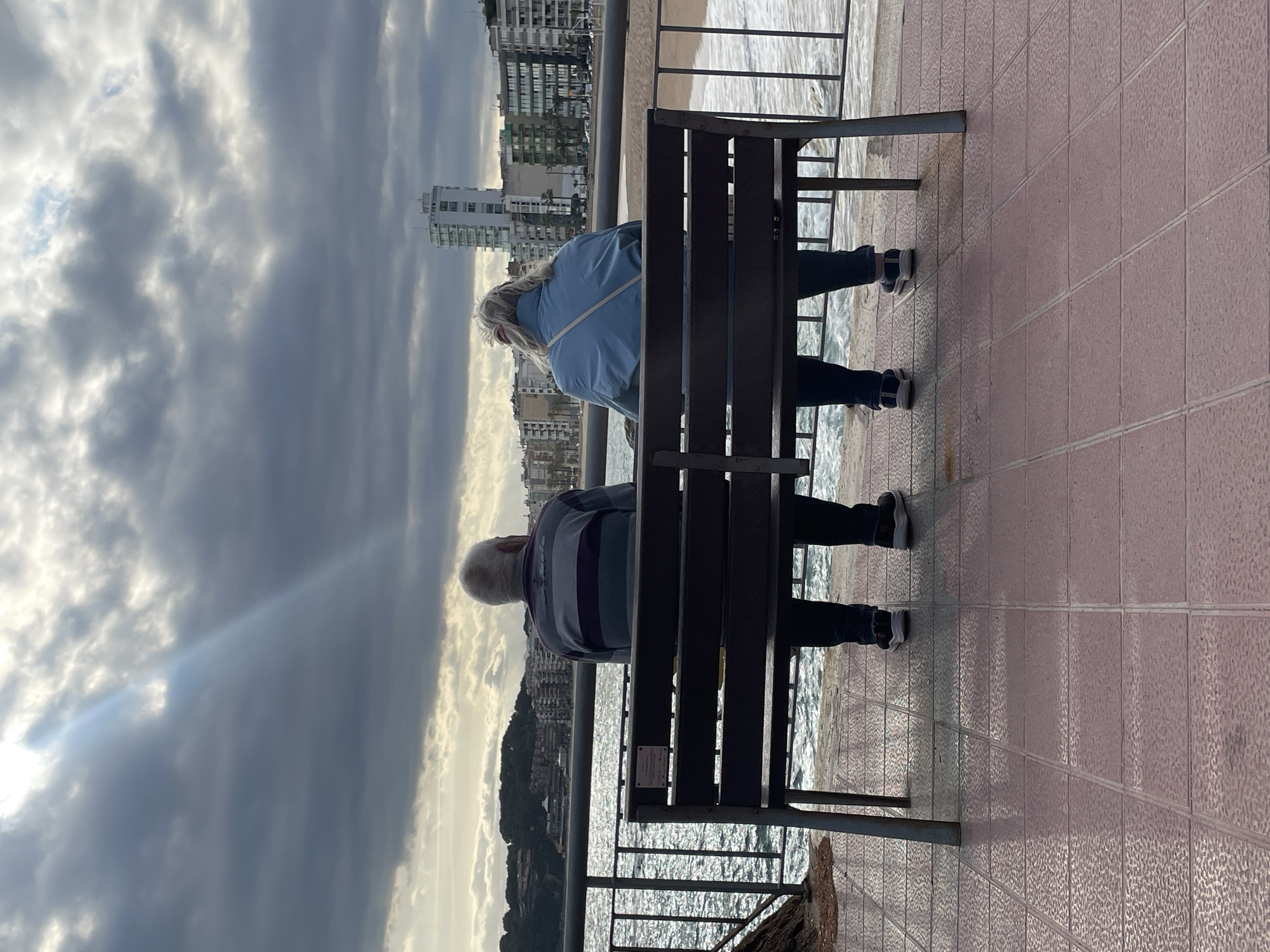 Two individuals are seated with their backs to the viewer on a dark slatted public bench located on a paved promenade in Lloret de Mar, Spain. The promenade is tiled with reddish-brown square tiles, some appearing damp or reflective. A dark metal railing separates the promenade from the sea and beach directly in front of the bench. The individual on the left is a male with short grey hair, wearing a horizontal striped long-sleeved shirt (grey, purple, dark grey bands), dark trousers, and dark athletic shoes with white soles. The individual on the right is a female with blonde hair tied back, wearing a light blue jacket or windbreaker, dark trousers, and dark athletic shoes with white soles. A light-colored strap, possibly from a bag, crosses her back diagonally. Both individuals are looking out towards the water and the distant coastline. Beyond the railing, the Mediterranean Sea exhibits moderate waves breaking onto a sandy beach. The background features the coastal urban landscape of Lloret de Mar, consisting of numerous multi-story buildings, including a distinctive tall white high-rise structure on the right, and other residential or hotel complexes. A vegetated hillside with some visible structures is present on the far left. The sky is largely overcast with dark grey clouds, but a distinct sunbeam penetrates the cloud cover from the upper left quadrant of the sky.