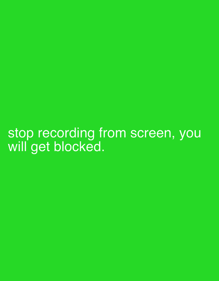 A green background dominates the image. White text at the bottom-center reads, "stop recording from screen, you will get blocked." The message is a warning or command, likely intended to discourage screen recording activity. The plain background suggests a simple, direct delivery of the message, prioritizing clarity over aesthetics.