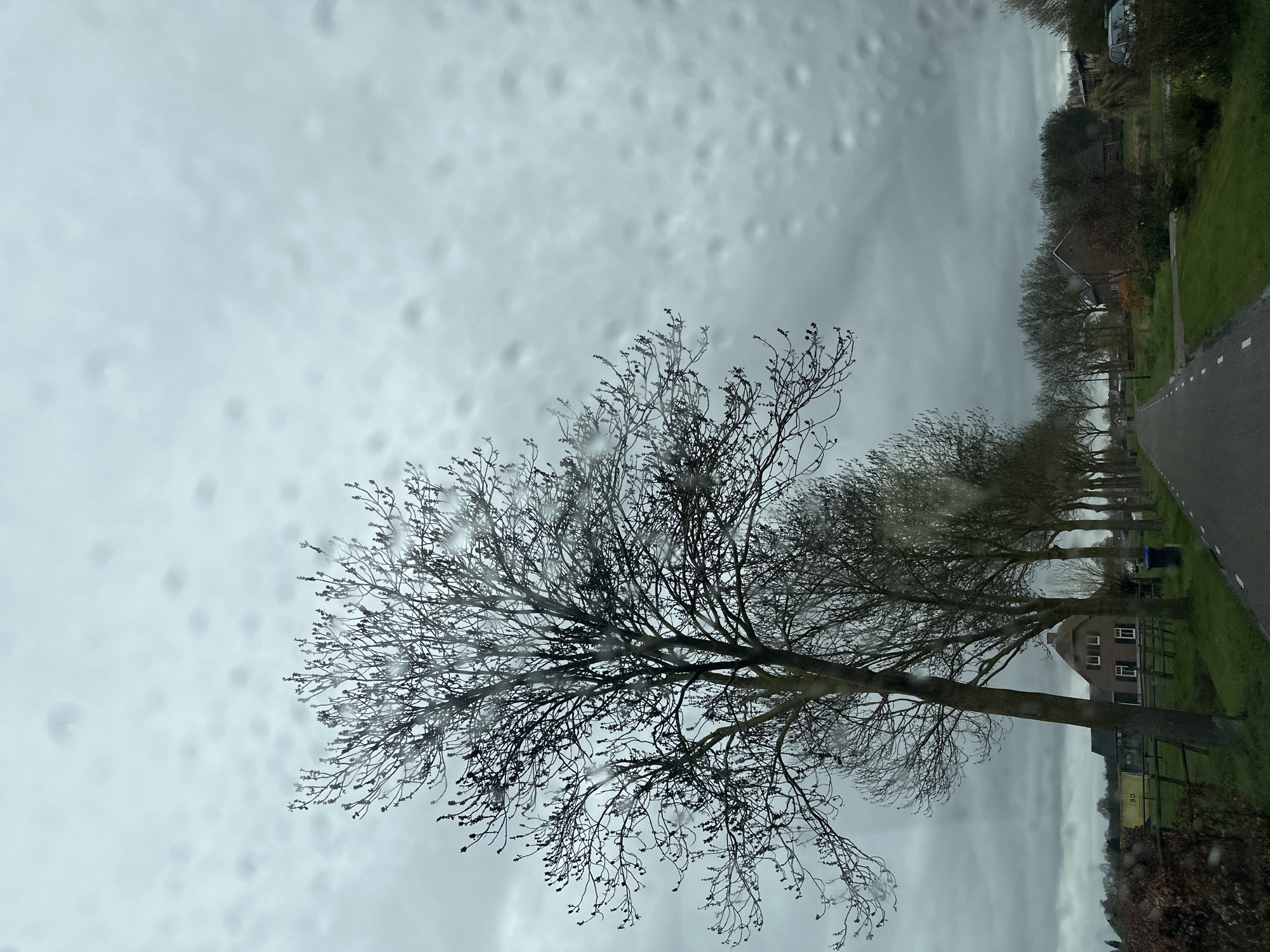 The image presents an overcast, rural road scene in Oploo, Netherlands, captured through a rain-streaked transparent surface, likely a vehicle windshield. A large, bare deciduous tree with visible buds dominates the left foreground. A paved two-lane road with white broken center lines extends into the middle ground, curving gently to the right. A linear arrangement of similar bare deciduous trees borders the right side of the road, receding into the distance. On the left side, beyond a wooden fence and a green grass verge, a traditional Dutch farmhouse with a prominent thatched roof and dark-shuttered windows is visible. Further left and behind the fence, a yellow shipping container is present. A blue municipal waste bin is positioned on the right grass verge next to one of the trees. Additional residential structures and a light-colored vehicle are discernable further down the road on the right. The sky is uniformly grey and heavily clouded, indicative of damp weather conditions. No individuals are visible, and no specific actions or interactions are depicted.