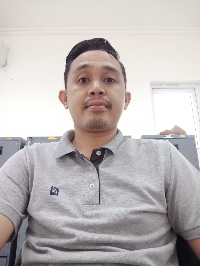 A man with dark hair and a mustache is shown from the chest up, wearing a light gray polo shirt with short sleeves and a dark trim around the neckline. He looks directly at the camera. Behind him is a white wall with a window to the right and gray storage cabinets. The lighting appears bright and even.